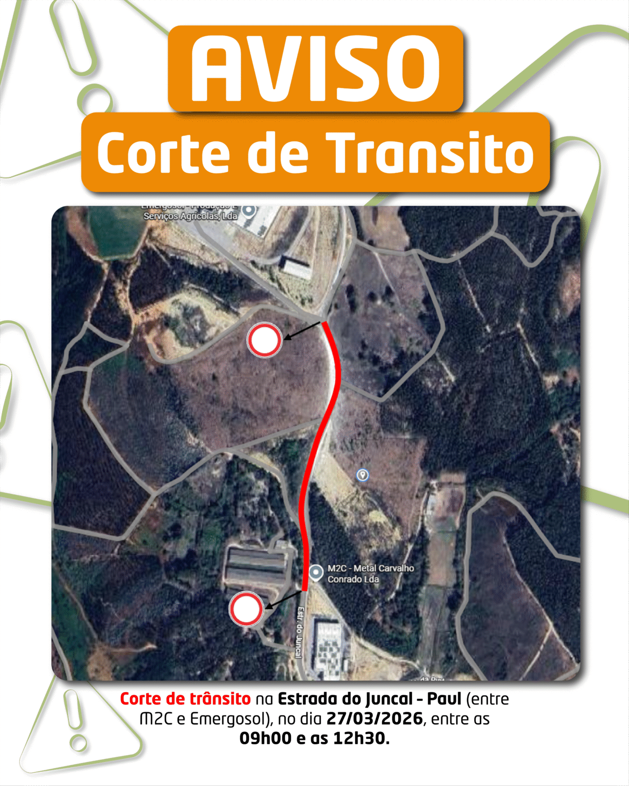 Corte de trânsito na Estrada do Juncal – Paul (entre M2C e Emergosol), no dia 27/03/2026, entre as 09h00 e as 12h30, para proceder à execução de uma travessia de rede.
